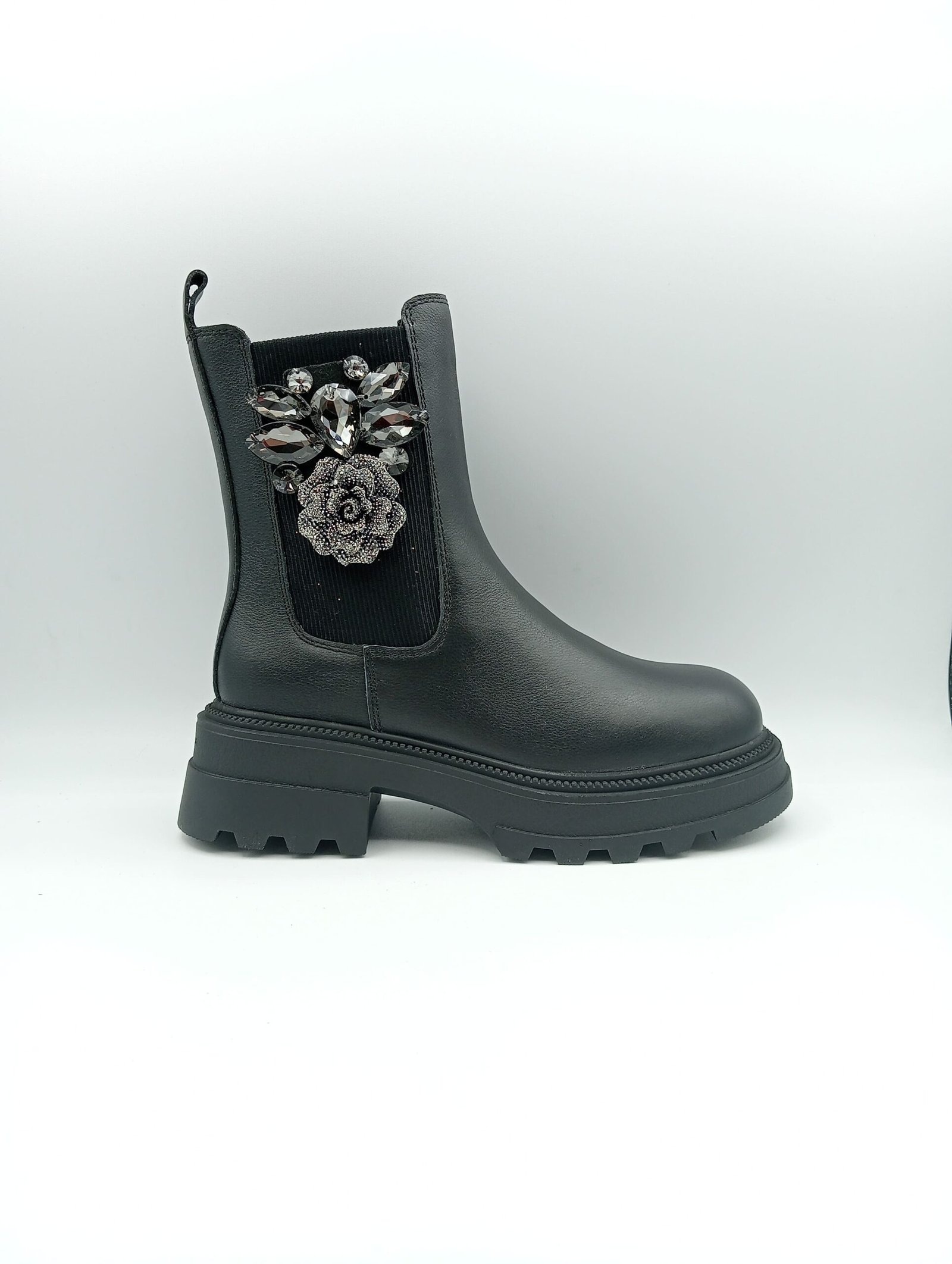 Il dettaglio che cattura subito l’attenzione è l’accessorio fiore applicato, che aggiunge un tocco di femminilità e personalità. Questo elemento decorativo trasforma il classico anfibio in una vera opera d’arte da indossare. Che si tratti di una giornata casual o di un’occasione speciale, il fiore dà al tuo outfit un’inconfondibile nota di stile.