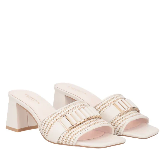 TOSCA BLU SANDALO OCEAN . Sandalo con fascia in raffia intrecciata con motivo geometrico e accessorio gioiello. Dettaglio in pelle arricciata.Tacco a blocco effetto vernice. COLORE: BEIGE