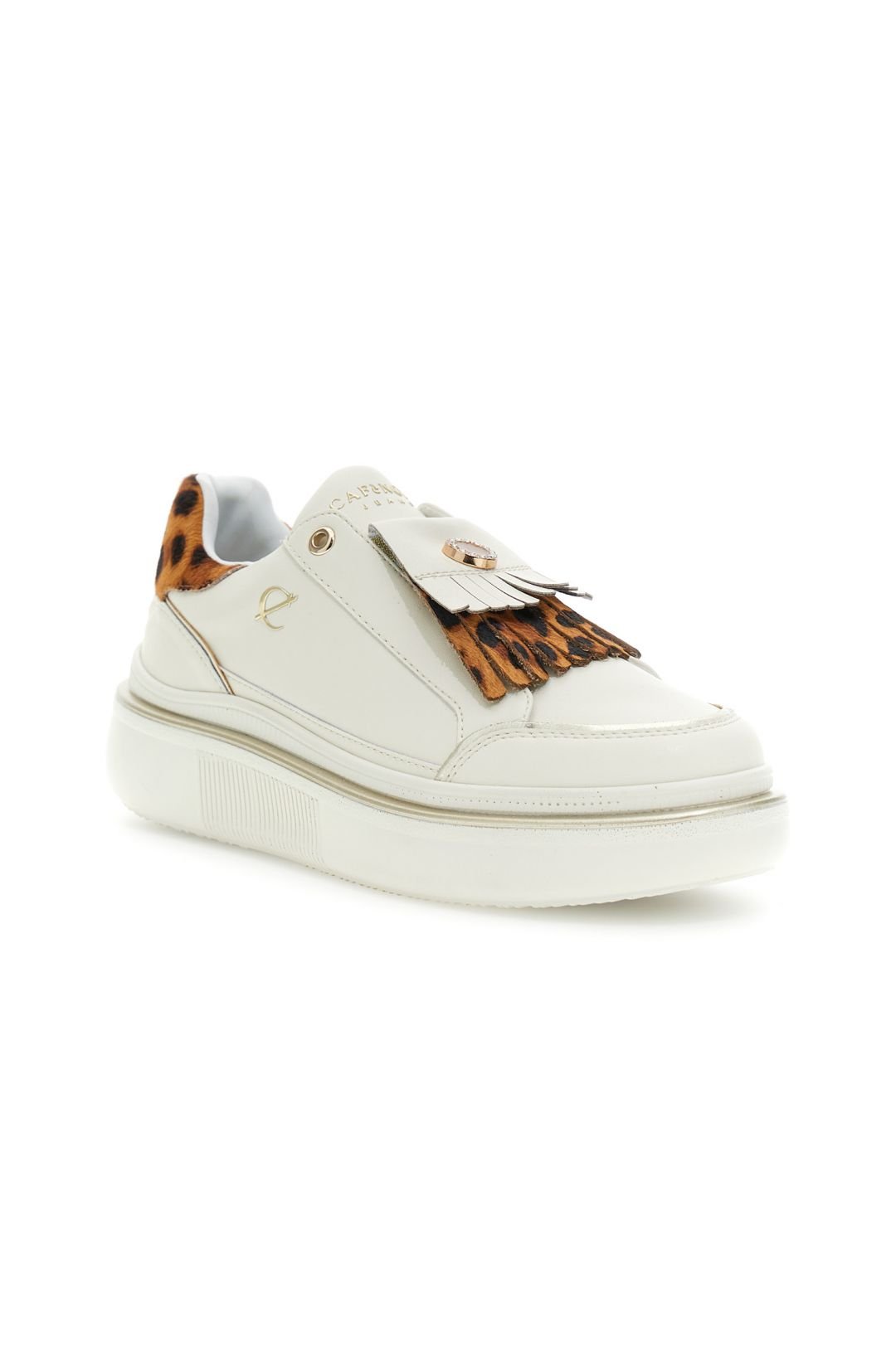 Aggiungi un tocco glam ai tuoi outfit con queste slip-on donna CafèNoir in pelle, impreziosite da un elegante dettaglio in effetto cavallino maculato sul davanti. Le frange decorative e l’accessorio gioiello regalano un look ricercato e moderno, mentre il logo laterale con monogramma CafèNoir completa il design con uno stile distintivo.